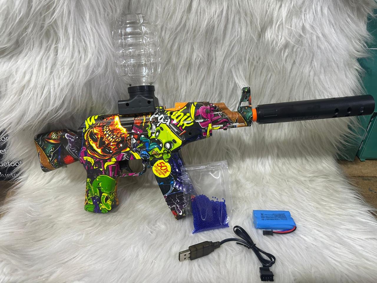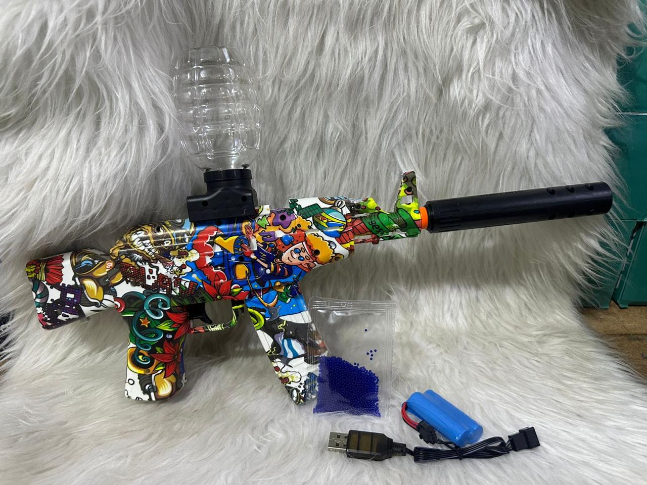 -Pistola eléctrica modelo AK47-Balas de hidrogel x 2000.-Baterías recargables.-Conector USB.-Granada almacenamiento bolas de hidrogel.-Silenciador.-Lentes protectores.
